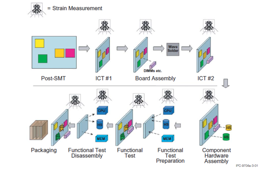 以上列表中,ICT 和 BFT 都是典型的最大應變/應變率的操作,但是其他流程的應力同樣會對 PCB 板有潛在的危害,所以建議進行上述所有流程的應變測試。