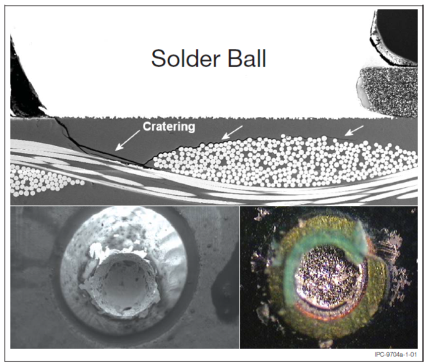 上圖-焊點損壞實例(頂部圖:承墊坑裂,左下圖:焊點本體失效,右下圖:焊接界⾯斷裂)
